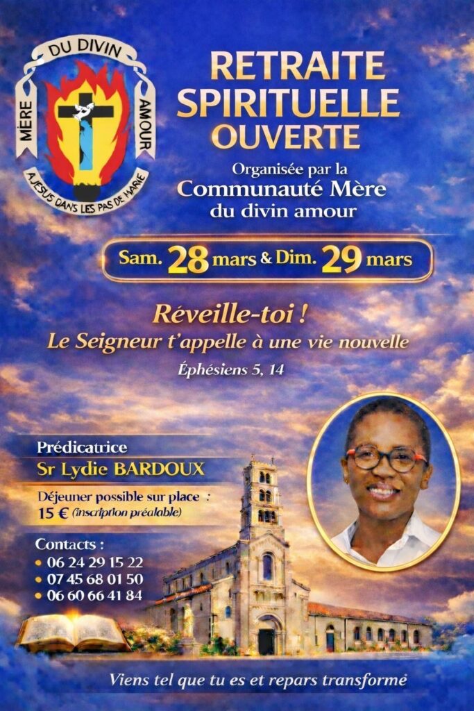 Durant ces deux jours, à travers les enseignements de Sœur Lydie Bardoux, les temps de prière, de louange et de fraternité, chacun pourra faire une véritable expérience de paix et de transformation intérieure. Ce sera un temps pour déposer ses fardeaux, recevoir l’amour de Dieu et repartir fortifié.